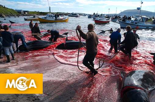 Tous les étés, pendant deux mois, la tradition permet aux habitants de traquer et de massacrer sans pitié des globicéphales noirs, des dauphins à flancs blancs, et de grands dauphins. Ces êtres sensibles et intelligents sont rabattus vers des baies peu profondes avant d’être cruellement égorgés sur la plage, dans un bain de sang insoutenable.