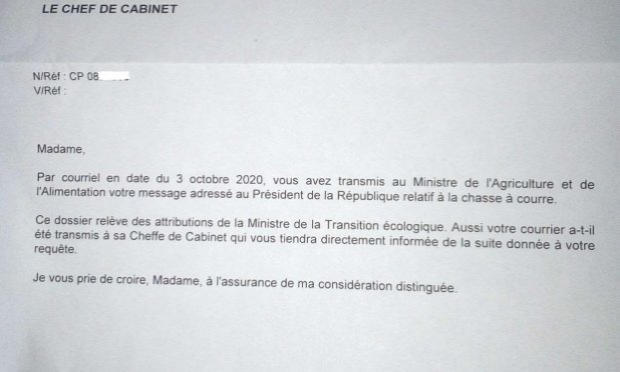 Le ministère de l' agriculture a retransféré ma requête à la cheffe de cabinet de Madame Pompili, ministre de la transition écologique car le sujet de la chasse la concerne.