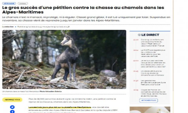 "Ces chamois vont être chassés où ils sont pourtant bien établis et ne font de mal à personne! Au contraire, ces animaux ont une utilité écologique. (...) Le chamois n'est pas une espèce destructrice ou qui doit être régulée, et ne fait l'objet d'aucune mesure de conservation", indique le texte qui demande purement et simplement "l’interdiction de la chasse au Chamois dans les Alpes-Maritimes".