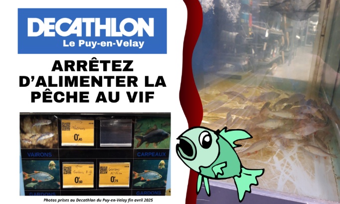 Au Decathlon du Puy-en-Velay, on peut encore acheter des poissons vivants… pour les utiliser comme appâts. Cela signifie les transpercer avec un hameçon, les plonger dans l’eau et les laisser agoniser des heures pour attirer un carnassier. Cette méthode, appelée pêche au vif, est une pratique cruelle que de nombreux pays, comme l’Allemagne ou la Suisse, ont déjà interdite. Et en France, la résistance s’organise : une proposition de loi a été déposée à l’Assemblée nationale, des villes comme Grenoble et Saint-Étienne s’y opposent clairement, et des associations comme PAZ mènent un combat acharné pour son abolition.
