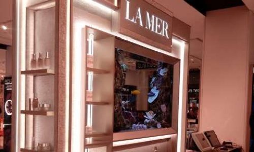 Des poissons dans un aquarium pour décorer le stand des produits cosmétiques de la marque LA MER au Printemps Haussmann (Paris).