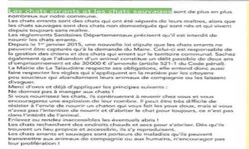Une convention avec 30 millions d’amis pour attraper et stériliser ces chats pourrait être une solution plus humaine non ? Que de dire aux gens de laisser mourir de faims des animaux qui ne sont là qu’à cause de la bêtise humaine !!!!!