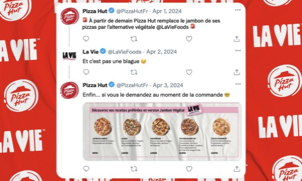 Si vous recevez ceci, c'est parce qu'il y a une avancée, en effet Pizza Hut a sorti 4 nouvelles pizzas végétariennes avec du jambon végétal La Vie, au même prix que celles au jambon animal.