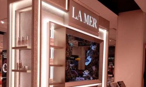 Immonde. Des poissons dans un aquarium pour décorer le stand des produits cosmétiques de la marque LA MER au Printemps Haussmann (Paris).