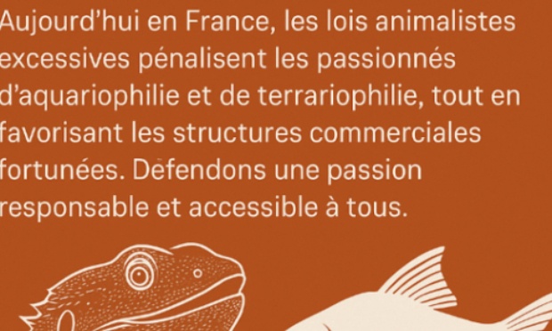 Aujourd’hui en France, les passionnés d’aquariophilie et de terrariophilie sont de plus en plus pénalisés par des lois animalistes excessives qui, sous couvert de bien-être animal, freinent la vente légitime d’animaux tels que les pogonas, les poissons exotiques ou encore d’autres espèces non domestiques.
