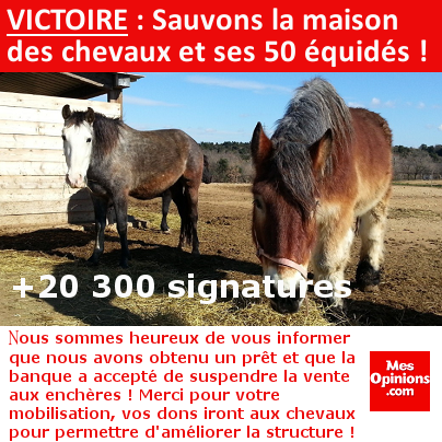 Nous sommes heureux de vous informer que ça y est, nous avons obtenu un prêt et la banque a accepté de suspendre la vente aux enchères. Merci pour votre mobilisation et les dons que vous avez fait, cette somme ira aux chevaux pour permettre d'améliorer la structure.