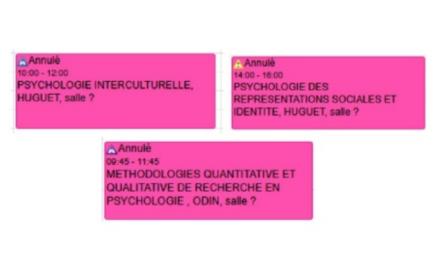 - 6 heures de "METHODOLOGIES QUANTITATIVE ET QUALITATIVE DE RECHERCHE EN PSYCHOLOGIE" et les 4 heures restantes sont également annulées