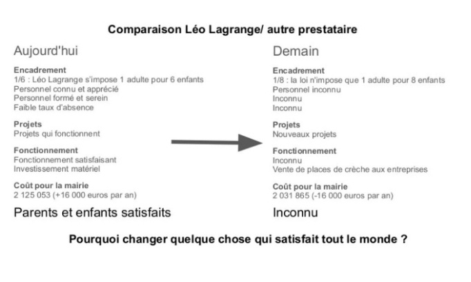 Selon les enquêtes de satisfaction, la fédération Léo Lagrange convient aux attentes des parents et des personnels. Nous parents, souhaitons continuer à confier nos enfants à une association d’intérêt public avec la plus grande confiance et non à une entreprise privée avec des objectifs de rentabilité.