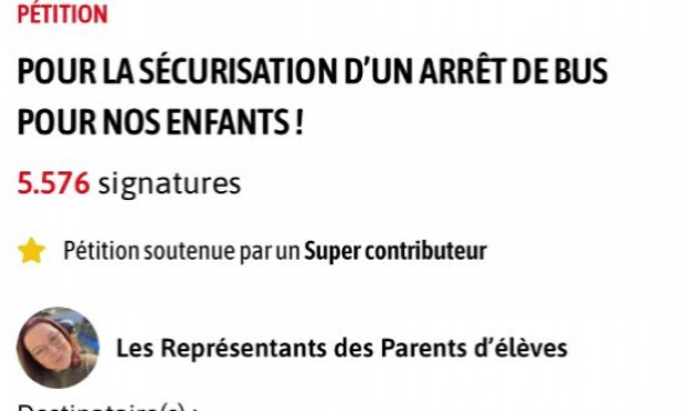 Au nom de la sécurité de notre communauté, je tiens à exprimer ma profonde gratitude envers chacun de vous qui a pris le temps de signer notre pétition visant à améliorer la situation du dangereux arrêt de bus (plus de 5500 signatures en 10 jours à peine).