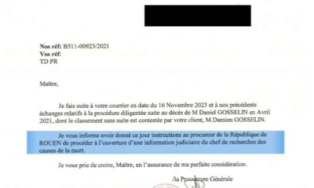 sur la base d'éléments non pris en compte, les autorités compétentes s'y refusant jusqu'à présent. Après "étude", le Procureur de la République de Rouen a reçu instructions de procéder à l'