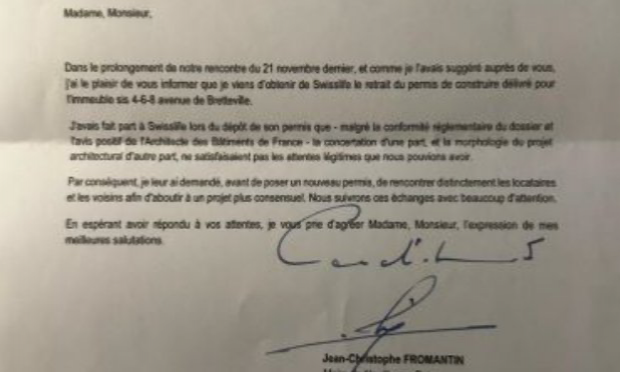 Vos signatures ont renforcé les recours engagés et permis, à l’issue d’une rencontre avec le Maire de Neuilly sur Seine, Monsieur Jean-Christophe Fromantin, d’obtenir le retrait du permis de construire Swisslife délivré pour l’immeuble 4-6-8 avenue de Bretteville.