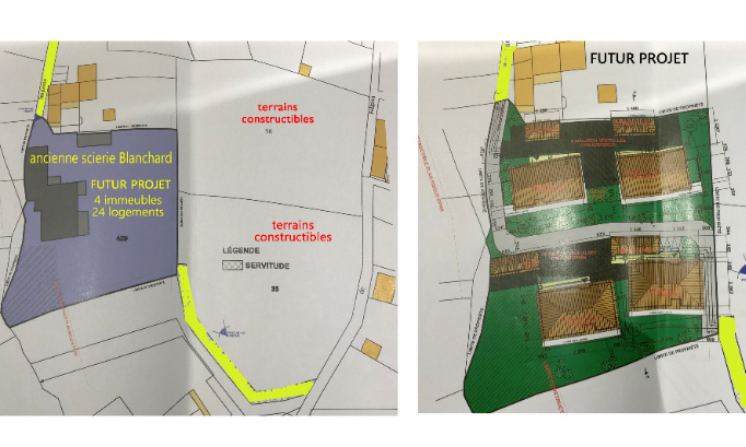 Il s’agit d’un projet de grande ampleur, comprenant la construction de 4 immeubles avec 4 box de garages. Chaque immeuble aura une hauteur d’environ 11 m (!) au faitage, et comprendra 6 logements de taille T3 ou T4 soit 24 au total. Chaque immeuble disposera de son propre box de garages séparé, dont la hauteur s’élèvera à environ 5 m (!) au faitage. Une zone de parking extérieure est également prévue pour chaque immeuble. La toiture des immeubles sera faite en bac acier ton gris et les façades en béton enduit ton cendre. Selon le plan actuel, le projet aura une emprise au sol de plus de 2000 m2 et l’accès aux immeubles se fera par la voirie existante du hameau, notamment via l’Impasse du Daurier et la Rue de Falipou (qui sera liée au terrain concerné par une servitude traversant le terrain AK 35).