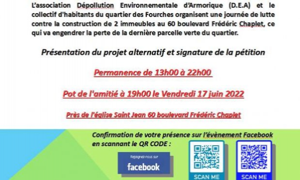 Rassemblement le 17 juin au Quartier des Fourches L’association Dépollution Environnementale d’Armorique (D.E.A) et le collectif d'habitants du quartier des Fourches organisent une journée de lutte contre la construction de 2 immeubles au 60 boulevard Frédéric Chaplet, ce qui va engendrer la perte de la dernière parcelle verte du quartier.