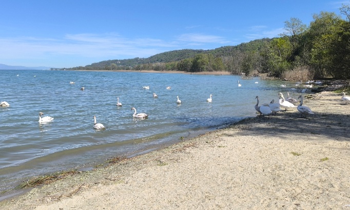 De plus ce lieux est un endroit de repos pour les cygnes qui profitent des algues sur les bords du lac et de la tranquilité qui n'est pas affecté par la surpopulation et la pollution des plages ordinaires.