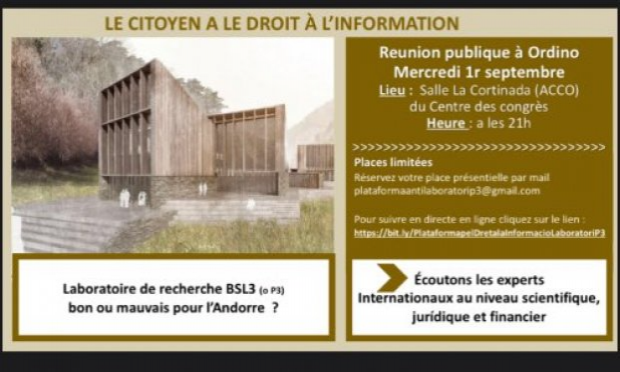 https://bit.ly/PlataformapelDretalaInformacioLaboratoriP3 Une réunion pour "le lancement de la plateforme contre l'installation du laboratoire P3 en Andorre" est organisée mercredi 1er septembre à 21h.