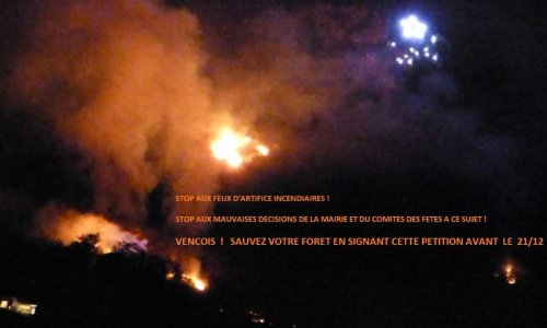 Acte de pyromanie déclenché par une folie administrative ? Enjeu politique à l'approche des élections pour flatter quelques vençois amateurs de feu d'artifices au détriment d'autres vençois victimes et au détriment de notre patrimoine naturel ?? Les questions sont posées