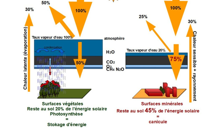 Contrairement aux idées reçues l'irrigation n'assèche pas les nappes phréatiques puisqu'elle contribue à l'alimentation du cycle, c'est au contraire le manque de végétation en été (après les moissons) qui coupe le cycle de l'eau ! Les villes ont enfin compris l'intérêt de la végétalisation mais il faut la généraliser partout en faisant des réserves d'eau l'hiver.