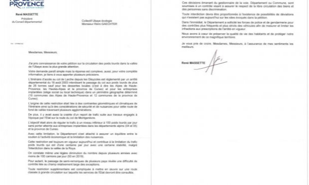 Le courrier du président du Conseil Départemental ne fait pas référence aux travaux de sécurisation de la RD 900 –accès au col de Larche estimés à 40 millions d’euros TTC (sur plusieurs tranches). Travaux à la charge des contribuables comme à terme ceux de la digue de Barcelonnette.