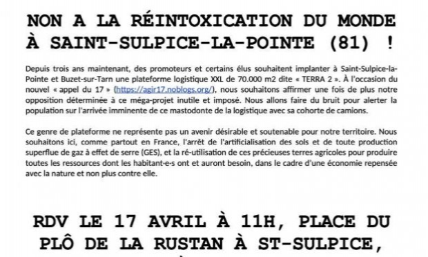 NON A LA RÉINTOXICATION DU MONDE À SAINT-SULPICE-LA-POINTE (81) ! Depuis trois ans maintenant, des promoteurs et certains élus souhaitent implanter à Saint-Sulpice-la-Pointe et Buzet-sur-Tarn une plateforme logistique XXL de 70.000 m2 dite « TERRA 2 ». À l’occasion du nouvel « appel du 17 » (
