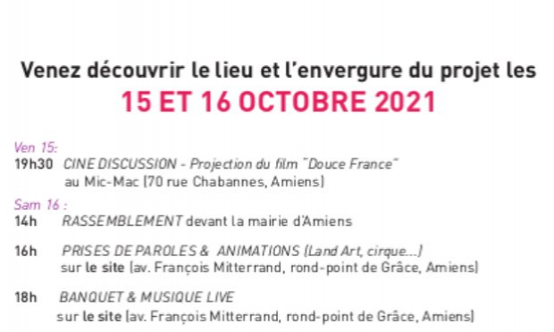 Pour découvrir sur place l'ampleur du projet rendez-vous ce samedi 16/10 à Amiens. Au programme, présentation du lieu, prises de parole, musique, atelier land art pour les enfants, et banquet!