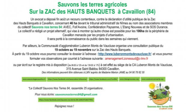 La consultation publique sur la Zac des Hauts Banquets organisée par l'agglomération Luberon Monts de Vaucluse se termine le 19 novembre 2020 à 17h.