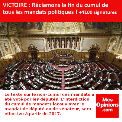 Merci à tous pour votre mobilisation. Le texte sur le non-cumul des mandats a été voté par les députés. L'interdiction du cumul de mandats locaux avec le cumul de mandats de député ou de sénateur sera effective à partir de 2017.