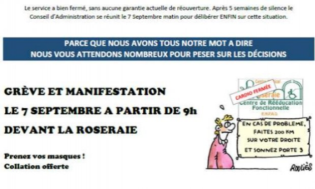Le Lundi 7 Septembre à 9h30, le Conseil d'Administration de la Roseraie se réunit pour délibérer sur le maintien (ou pas) de la fermeture du service de réadapation cardiaque.