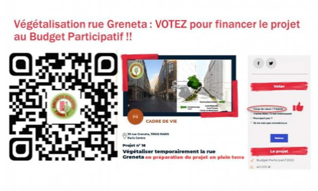 - Une fois soumis aux votes, la Mairie de Paris Centre l’a renommé : « Végétaliser temporairement la rue Greneta » sans nous consulter et nous a indiqué « Ne plus pouvoir changer les titres des projets soumis aux votes »