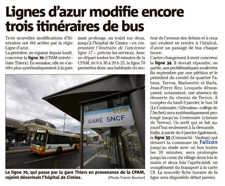 Voici du nouveau pour notre pétition, c'est loin de ce qu'on a demandé, mais en attendant c'est toujours un petit geste allant dans notre sens : à partir du 6 janvier, la ligne 34 sera systématiquement prolongée jusqu'à l'arrêt "le Centenaire" (avant il fallait faire la demande à l'avance pour les 2 derniers arrêts de la ligne)