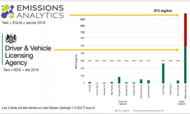 - A l'été 2016, puis en janvier 2018, le DVSA et l'organisme indépendant Emissions Analytics ont testé un Nissan Qashqai 1.2 DIG-T avec des rejets plus qu'étonnants, ce que Nissan a confirmé sans s'en expliquer outre mesure (à l’époque ces véhicules n’étaient pas testés en conduite réelle, seulement en banc de test)...