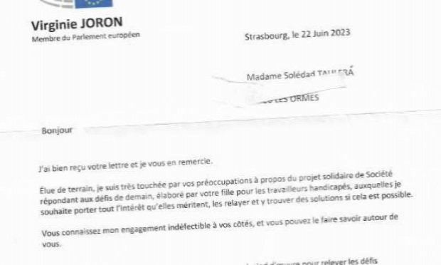 Je vous remercie de votre soutien ; vu que je vous annonce une nouvelle d'encouragement car ma mère vient d'obtenir une réponse de sa démarche auprès de la Députée européenne Virginie JORON qui m'annonce qu'elle ce tient à nos côtés pour tenir dans l'adversité. Voir image ci-dessus.