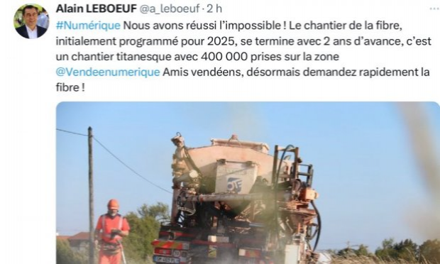 Publication ce soir même sur X ex Twitter de la communication du Président du Conseil Départemental de Vendée et "accessoirement" Président de Vendée Numérique dont vous trouverez la capture écran ci dessous.