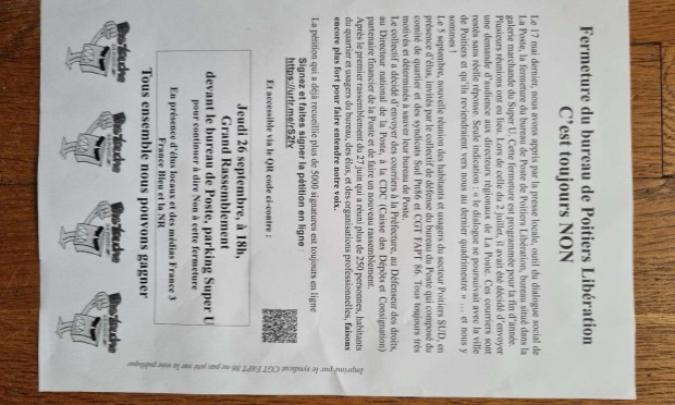 Nouveau rassemblement le jeudi 26 septembre devant la poste Libération à 18 heures, venez nombreux pour la défense de notre bureau de poste, contre sa fermeture.