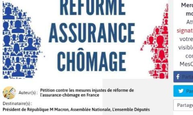 ,En cette période où de nombreuses réformes de l'assurance-chômage sont en cours en France, je tiens à vous inviter à signer une pétition visant à exprimer notre désaccord avec les mesures injustes qui sont proposées.Cette pétition vise à faire entendre notre voix collective et à demander des changements qui prendront en compte les besoins réels des travailleurs et des personnes en situation de chômage.Votre signature est un pas important vers la défense des droits des travailleurs et des personnes en recherche d'emploi. Merci de prendre quelques instants pour signer la pétition et de la partager avec vos contacts afin que nous puissions mobiliser un maximum de personnes.
