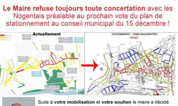 Mais le maire décide finalement de le représenter au conseil municipal du 15 décembre prochain ! Il remet en cause la légitimité de la pétition en nous expliquant que les signataires ne sont pas tous Nogentais. Pire, il persiste en refusant toujours toute concertation avec les Nogentais préalable au vote. Après le vote du 15 décembre il sera trop tard pour concerter.