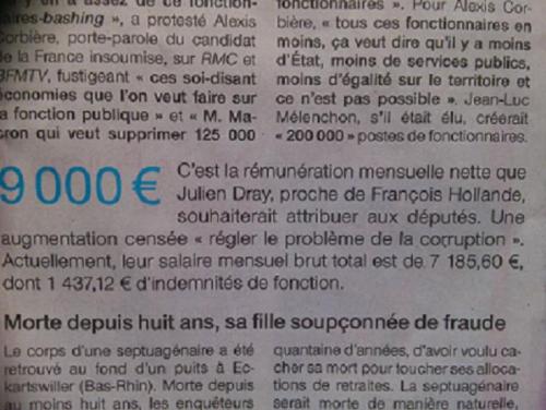 Bonjour , les députés ont déjà un salaire , pourquoi devrions nous accepte de les payes plus cher pour évité la corruption , Mr julien dray propose de mettre actuellement leur salaire de 7185,60 € brut a 9000 € a nette mensuel, il faut vérifier tous les ans leur enrichissement, c'est une honte ,alors que des familles sont dans le besoin , cordialemnt